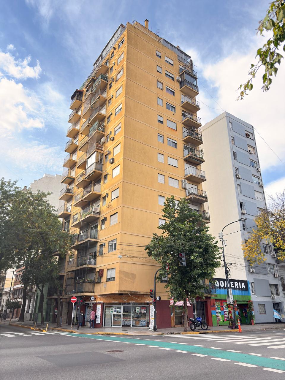 Departamento de 2 ambientes al frente con balcón. Edificio en esquina de 14 pisos y 4 deptos. por piso. Ingreso a hall de entrada, luego sigue el living comedor con salida a balcón sobre la Av. San Juan, Cocina amplia, amplio dormitorio con placard, Baño completo.