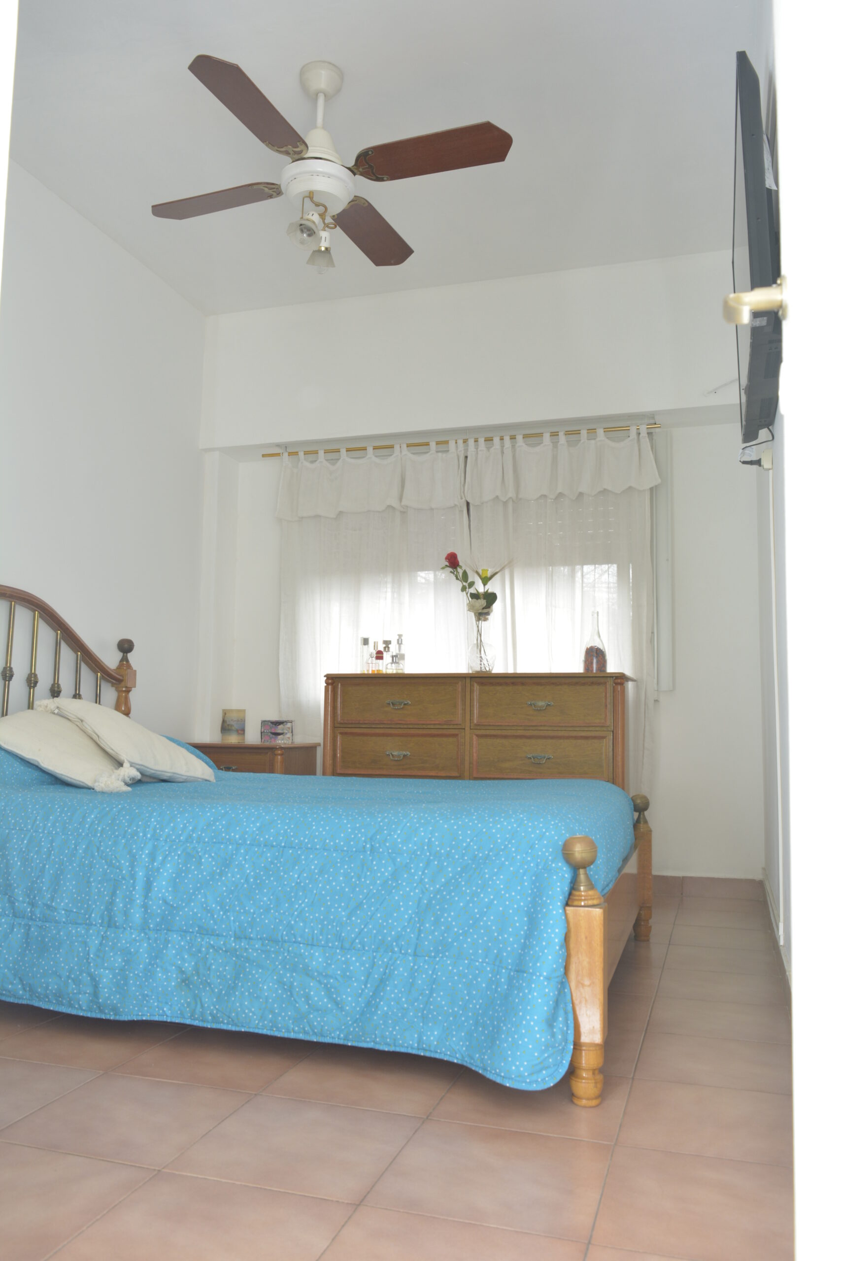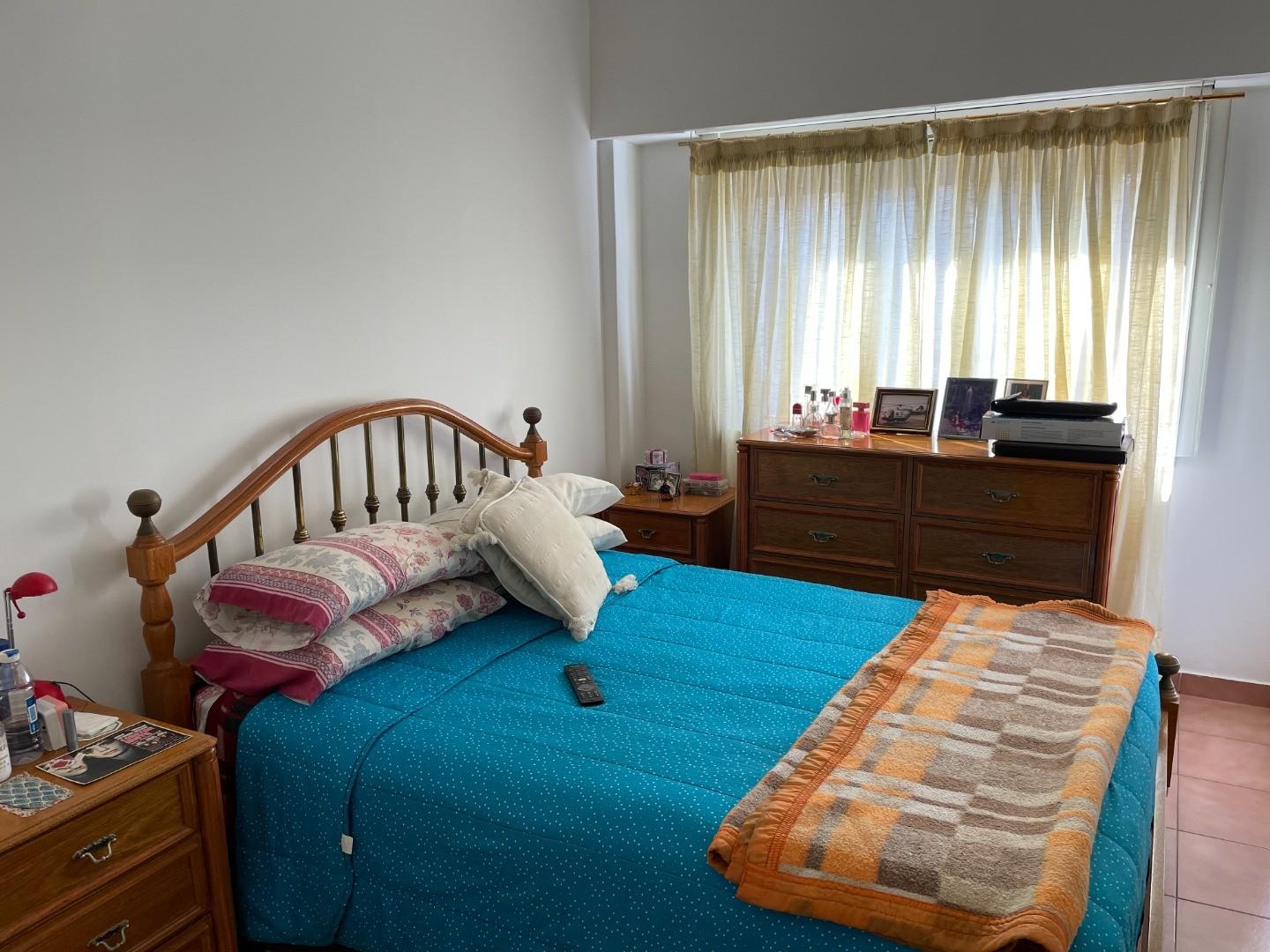 Habitación principal con vista a la calle muy luminosa, placar e interiores baulera y ventilador de techo.