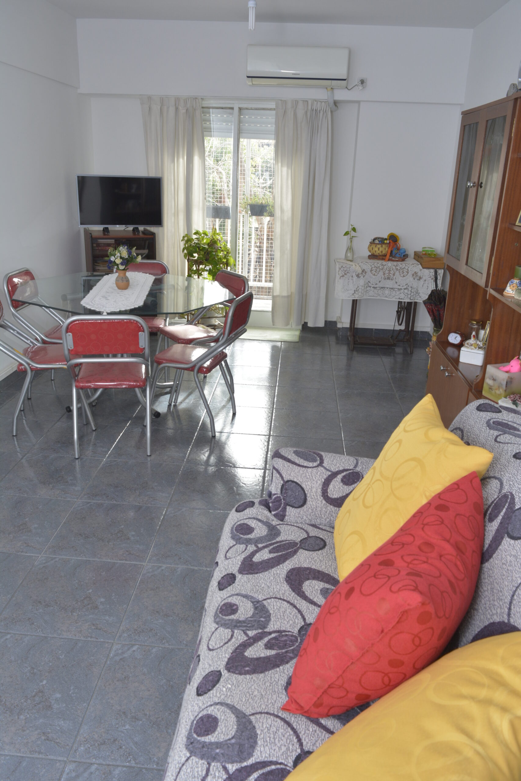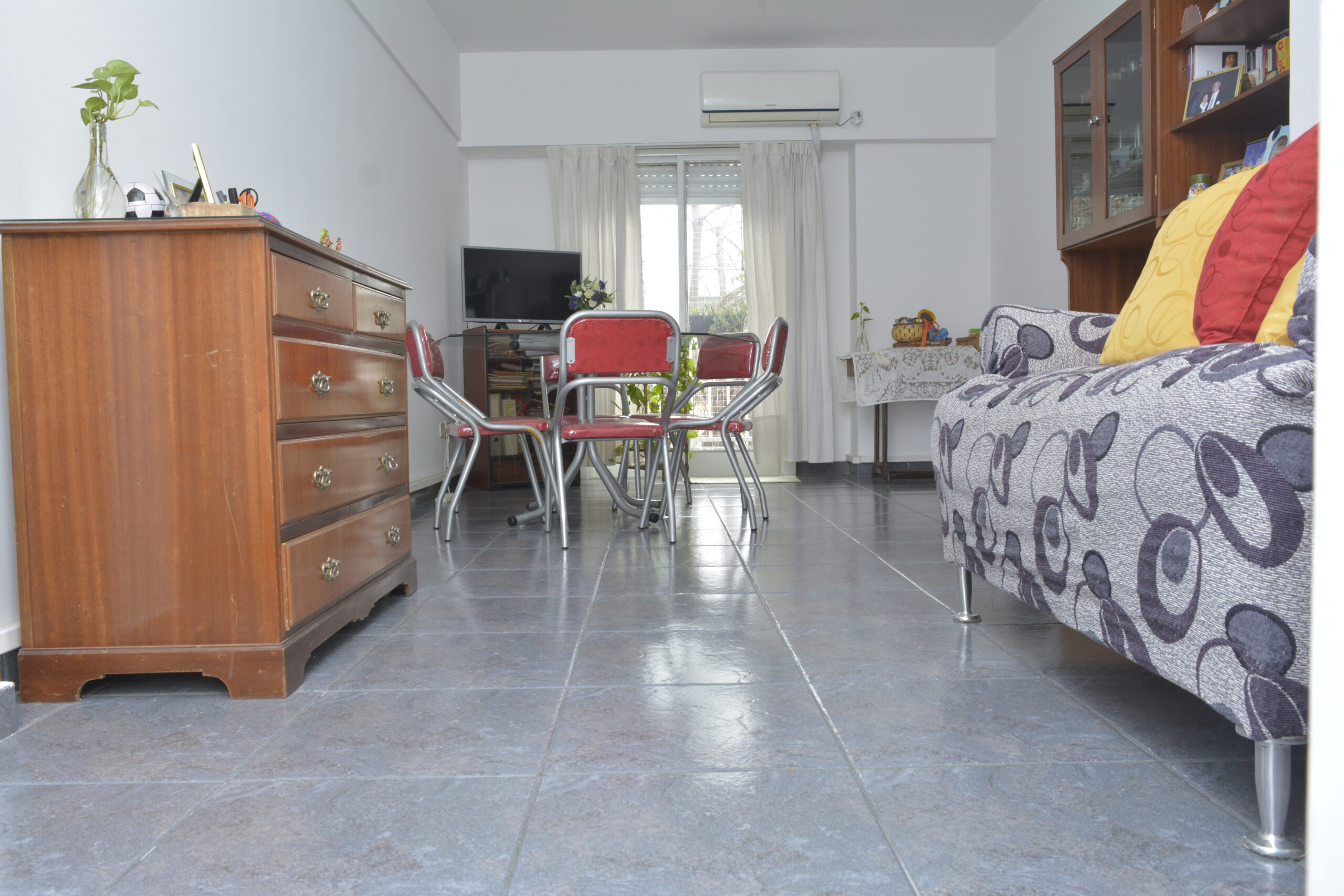 Living comedor amplio con aire acondicionado y con salida al balcón que tiene reja y protección, super luminoso y pasillo de distribucion .
